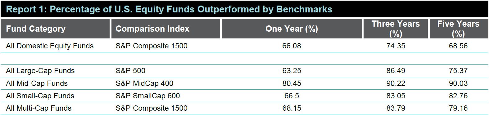 They do this analysis every year, for all different types of US stock funds, for all different types of US bond funds, and even for international funds. They analyze 1, 3 and 5 year performance periods.