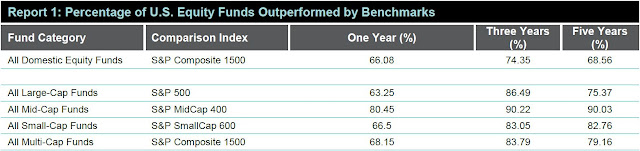 The screenshot above is just a snippet of the information in this report. The numbers shown in the three right-most columns are the percentage of active funds that were outperformed by their benchmark. As you can see, in almost all cases the majority of active funds lost.